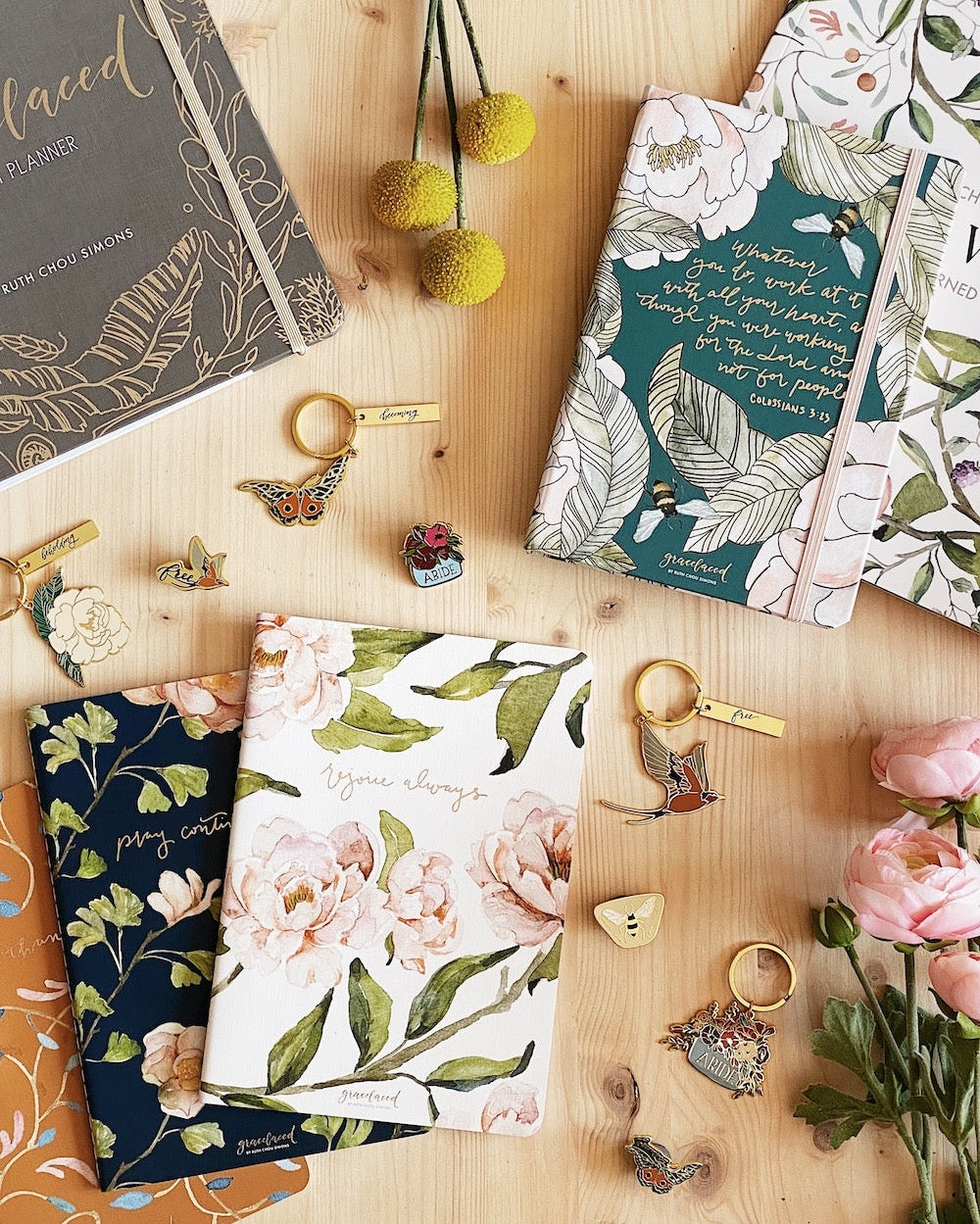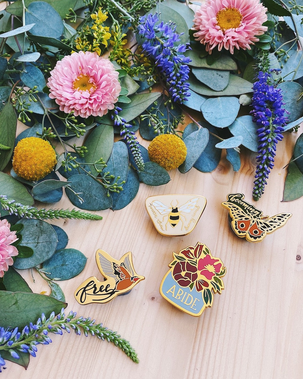 Be reminded to abide in Christ as you grab your bag or grab your jacket on your way out the door through this beautiful 'Abide' pin featuring art by Ruth Chou Simons.