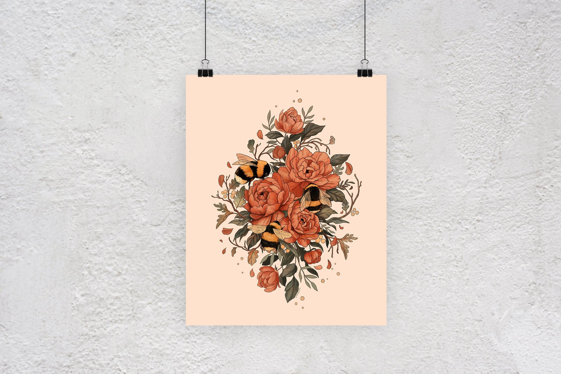 Bees & Peonies Art Print. An adorable bee illustration on a bed of blooming flowers.