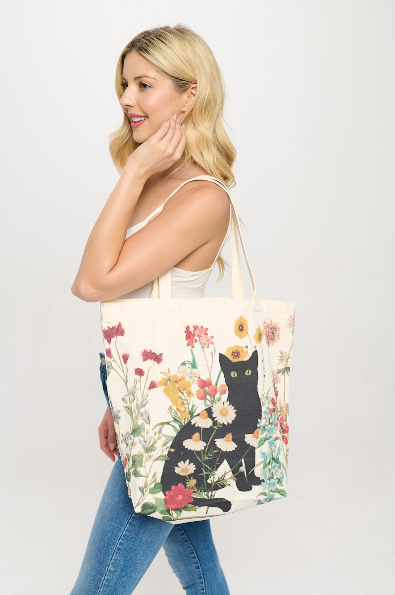 Bring a touch of whimsy to your everyday routine with this enchanting tote bag, featuring a playful cat silhouette surrounded by vibrant, blooming flowers. The delightful design strikes the perfect balance between charming and eye-catching, making it the ideal accessory for any occasion. With a spacious interior and sturdy handles, this tote is perfect for carrying everything you need, from market finds to beach essentials.