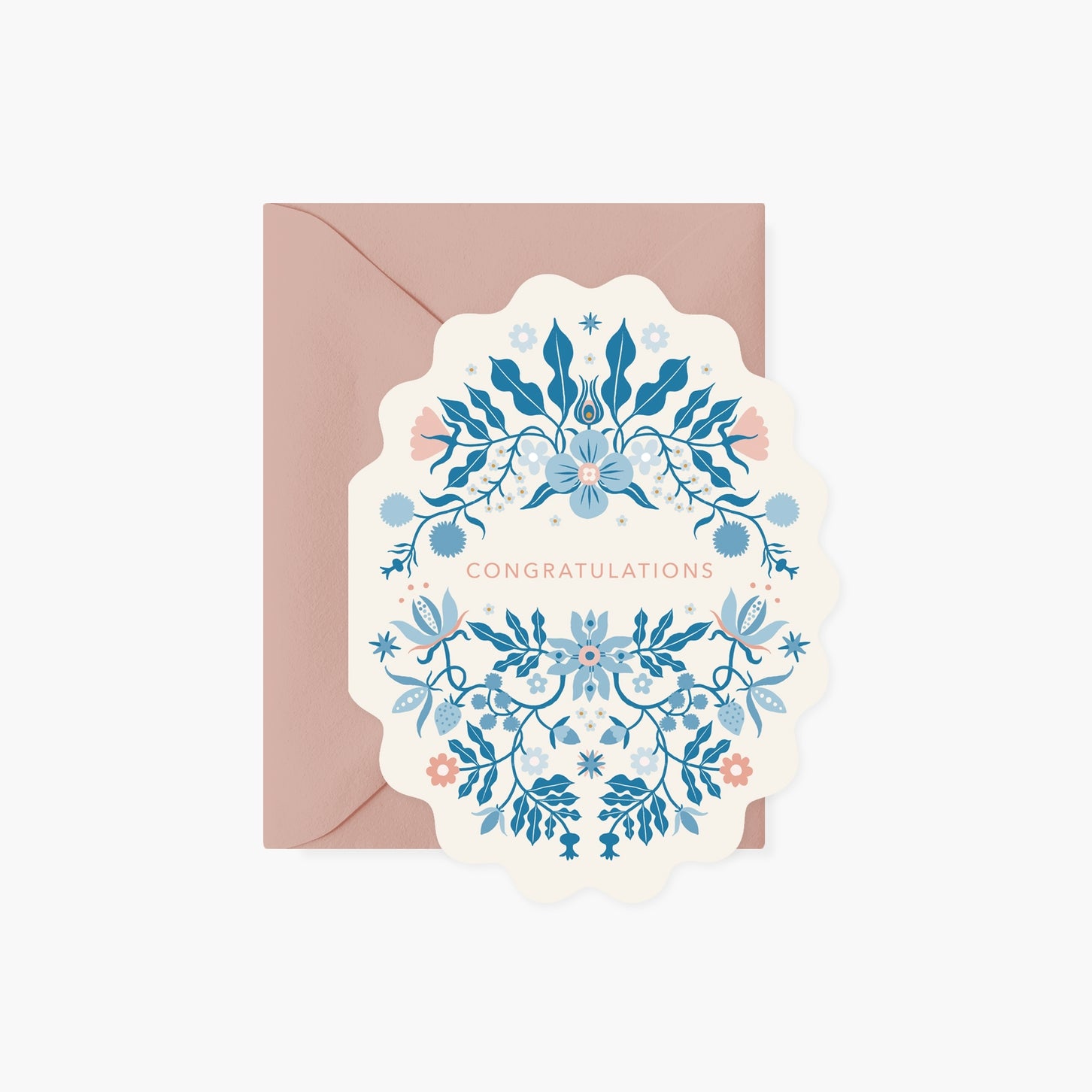 A beautiful and eye-catching card with blue florals and pink accents. Card exterior reads in all-caps: "congratulations"