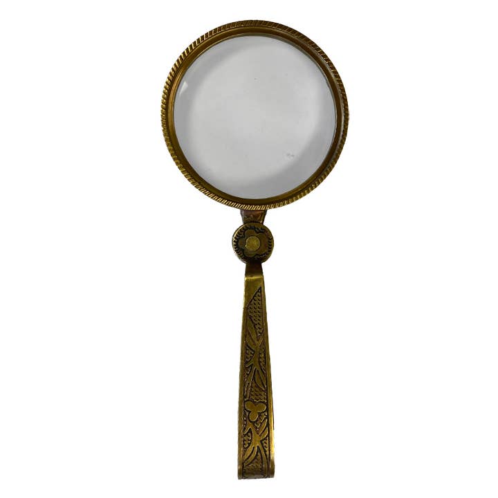 This unique, solid brass magnifying glass is perfectly portable due to its clever folding handle with intricate design.