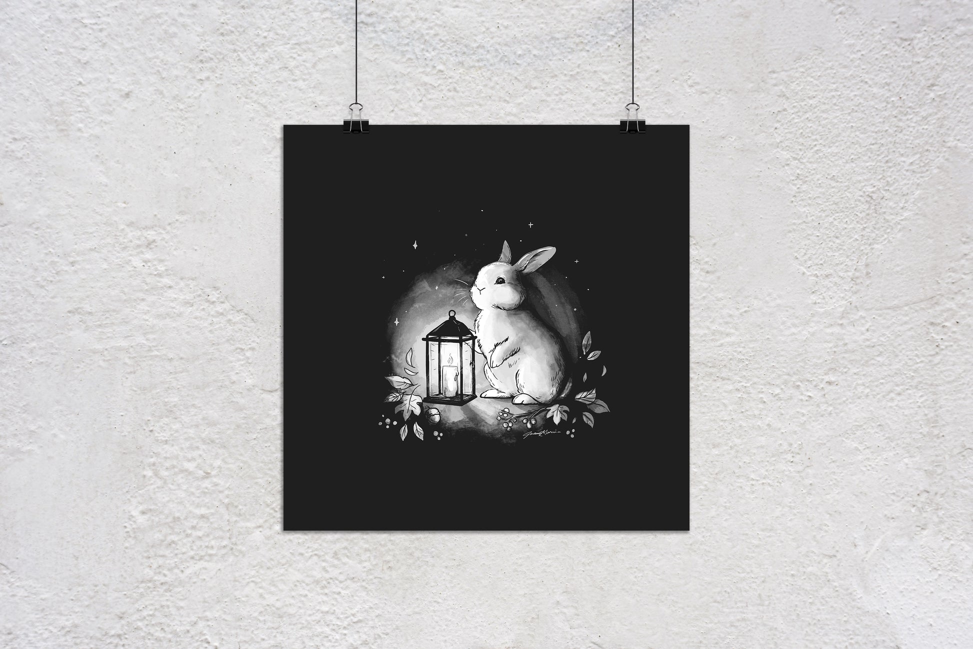 Bunny with Lantern Art Print. An adorable rabbit illustration with a white glowing lantern.