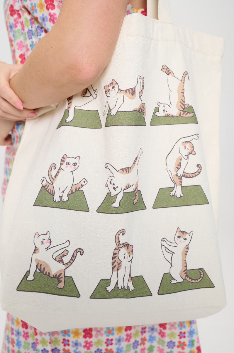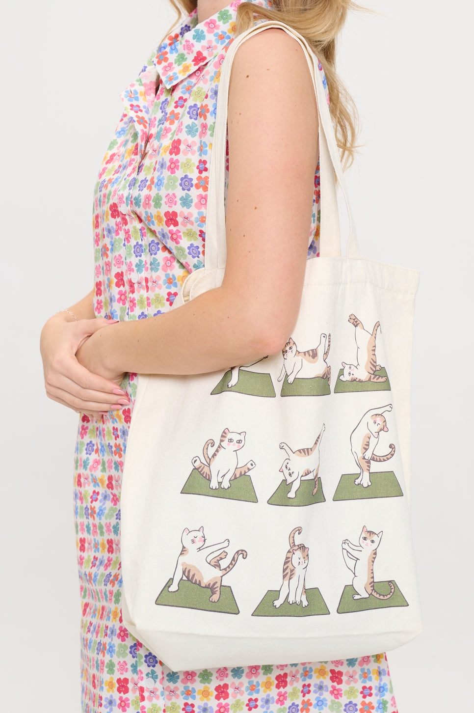 Get ready: the perfect tote is here. A beautiful cream tote with some adorable new friends doing yoga printed on both sides. This tote is ethically-made and eco-friendly, with long handles, an inner pocket, and zippered main opening!