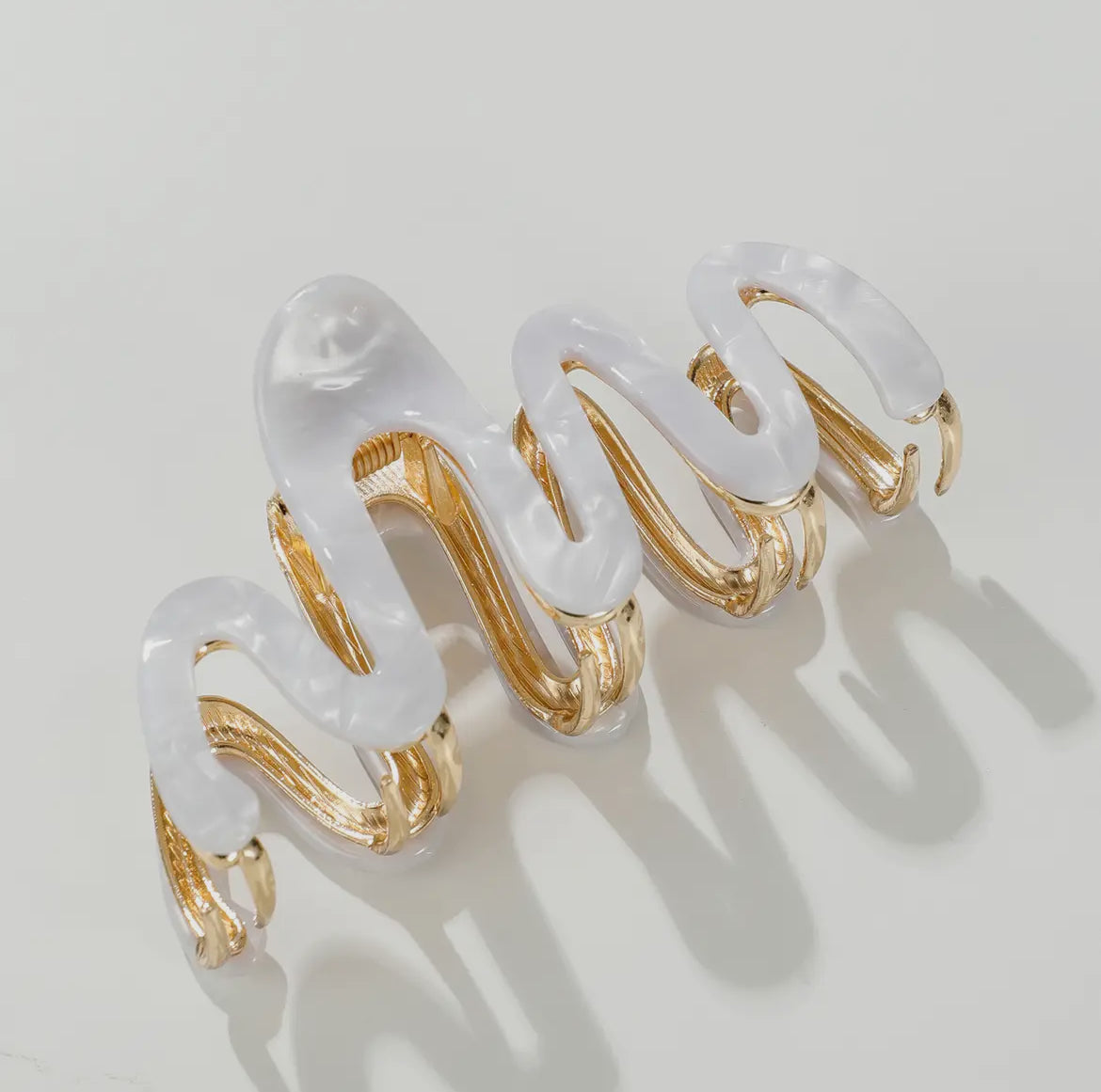 Featuring a beachy wave design, this 4inch claw clip is a flat design that will hold short/med hair and is great for half-ups. This claw works best with thinner/lightweight hair. Available in our core colors: coastal blue, saltwater blue, and pearl. Made with eco-friendly material that is both durable and comfortable.