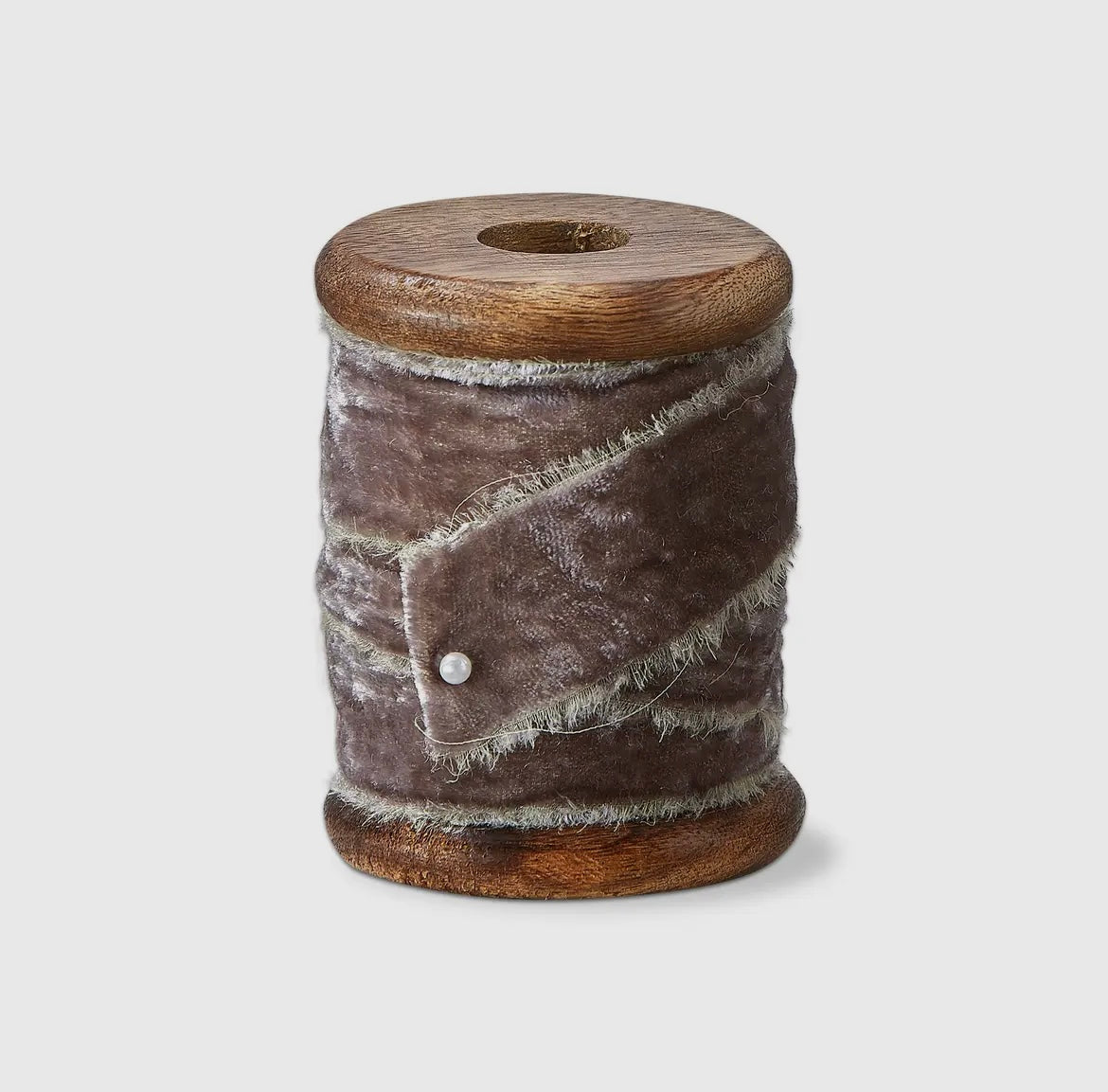 Artisan crafted Adn velvet ribbon in a wintery gray color with soft, plush texture. This accessory is perfect for any holiday decor!