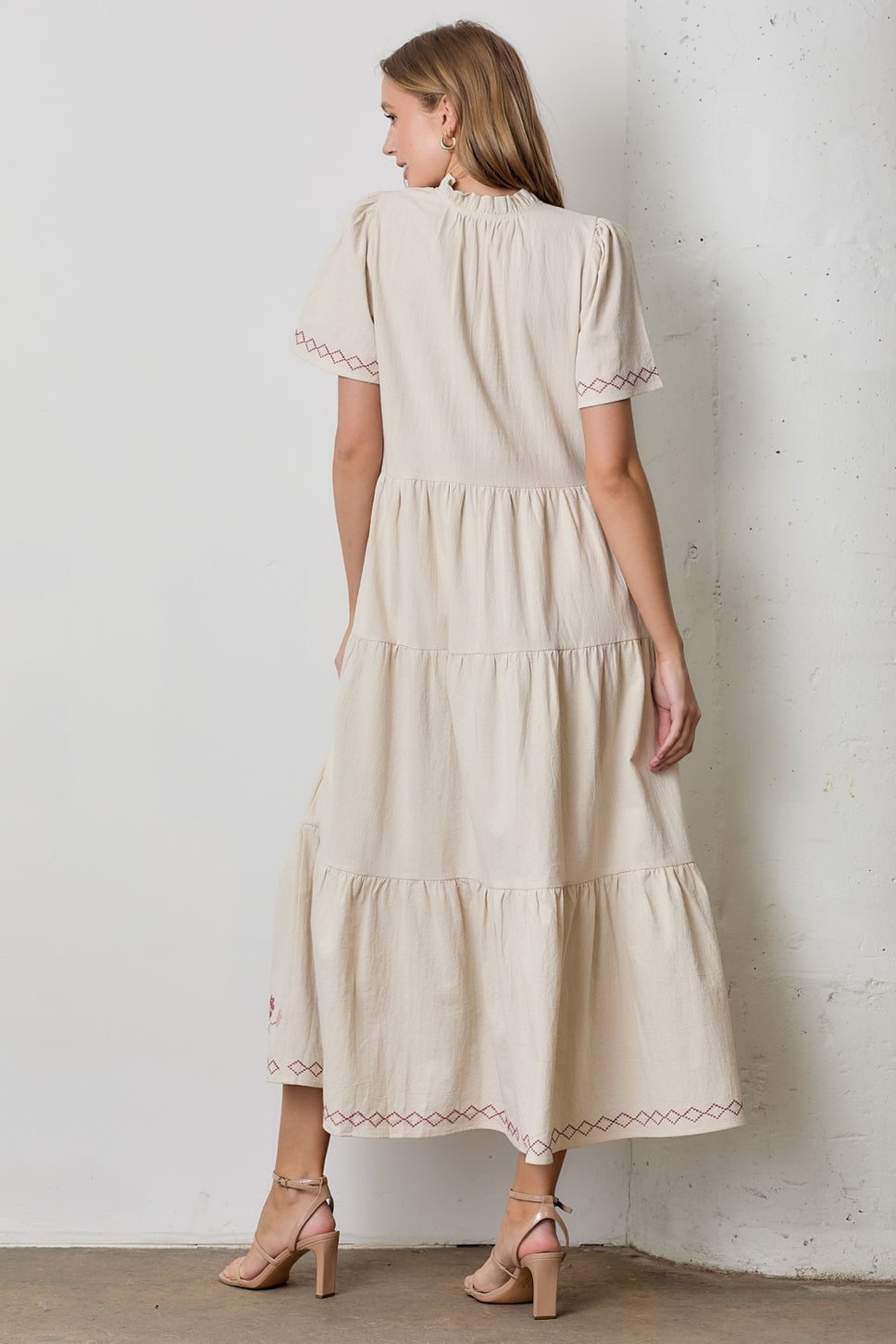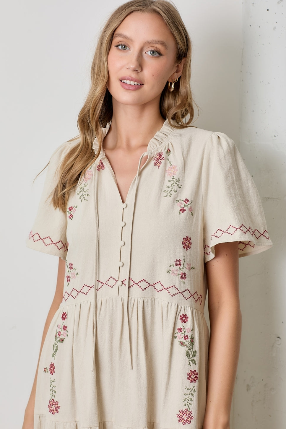This dress is the perfect blend of feminine, bohemian, and classic. This cream embroidered dress is the perfect piece to transition from summer to fall.