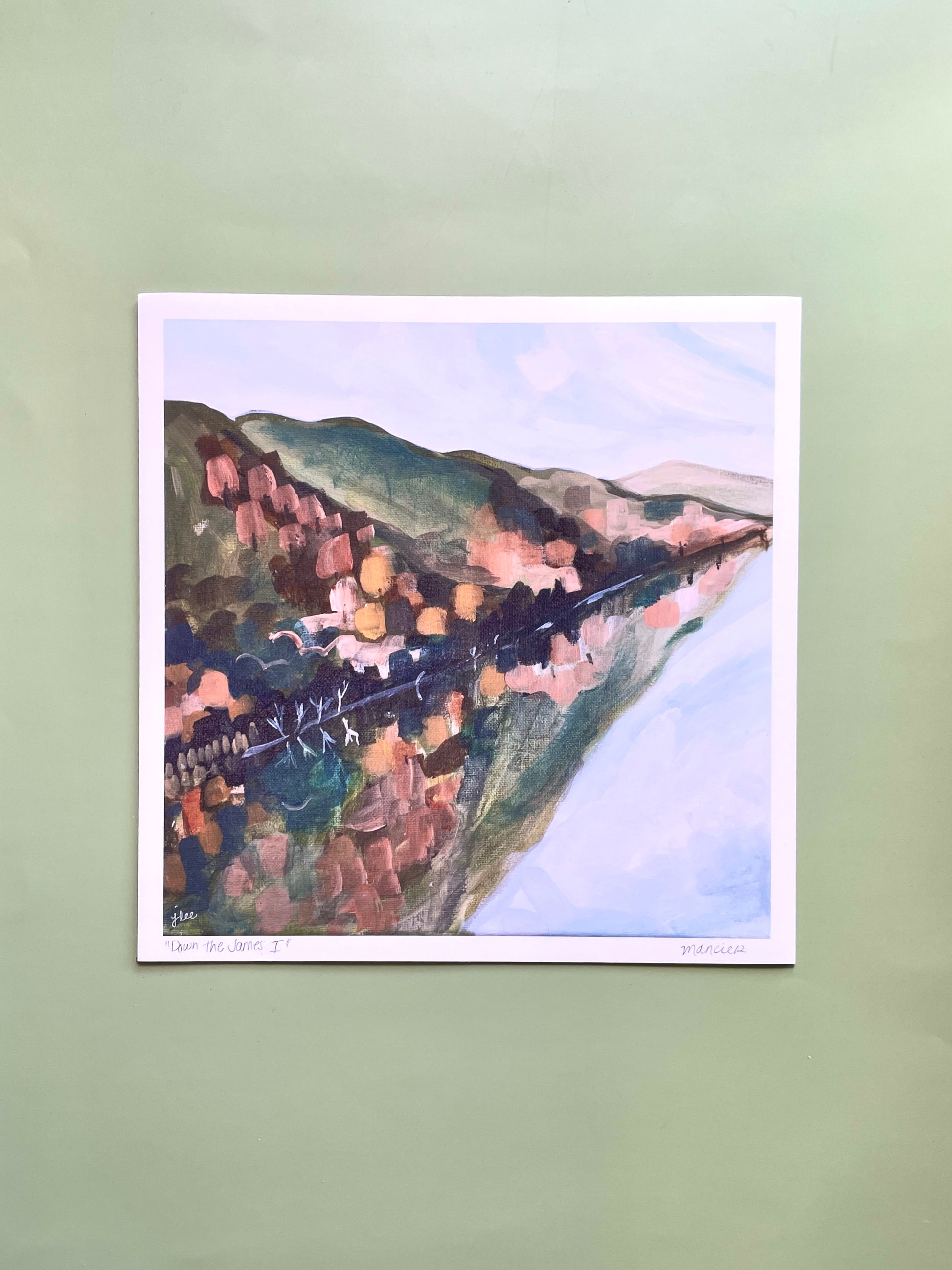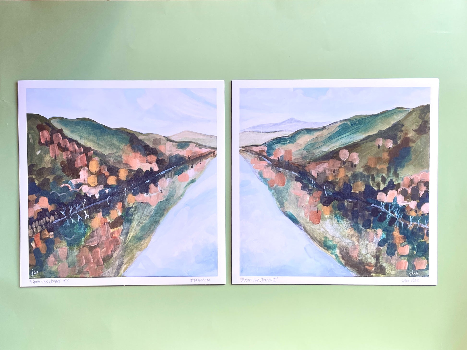 Take in the beautiful landscapes of the Blue Ridge and James River, captured in paint and printed to display in your home! This painting can be displayed on its own, or displayed with its partner, "Down the James II"; when put next to each other, it looks like you're looking down the James River!