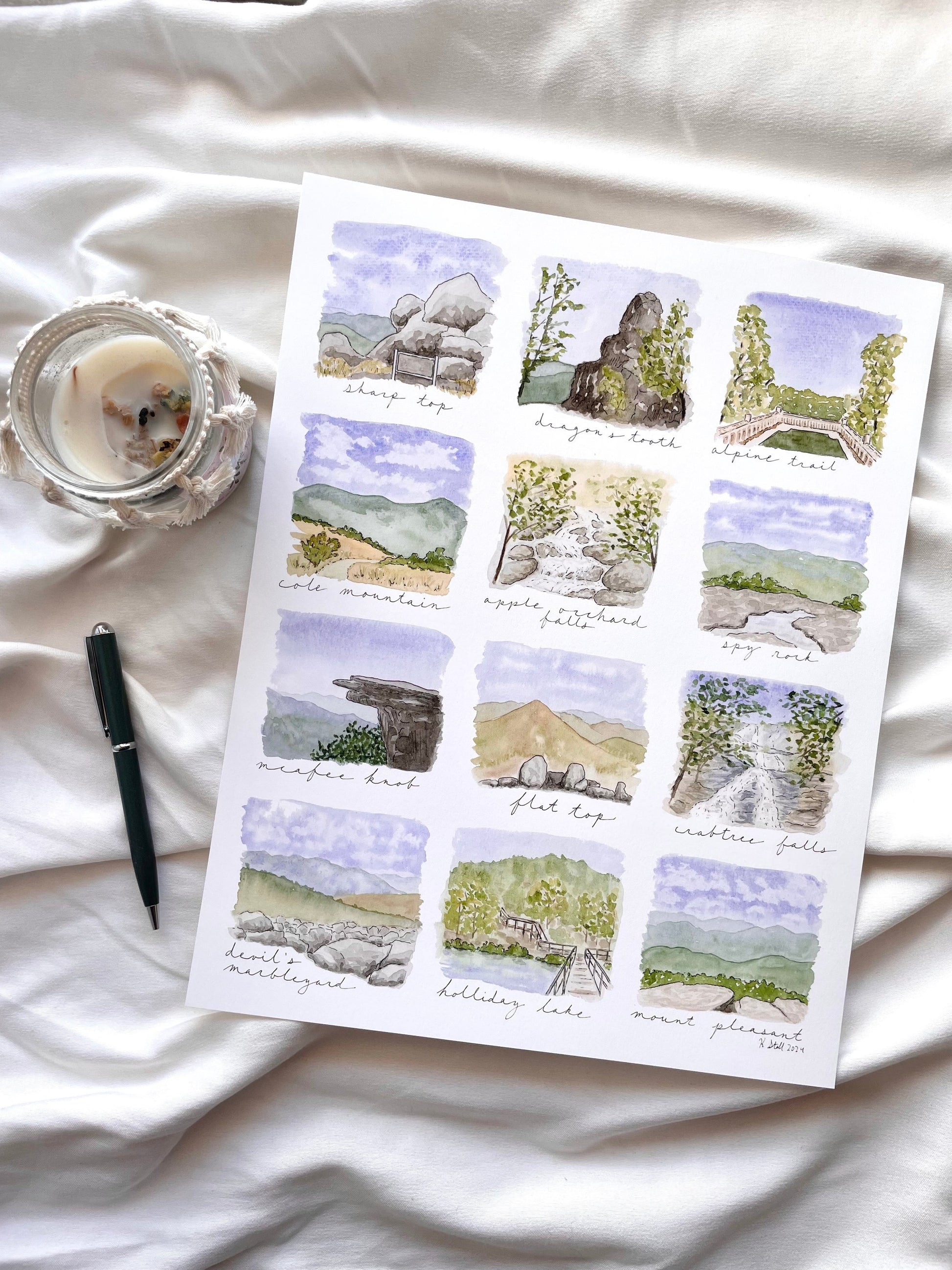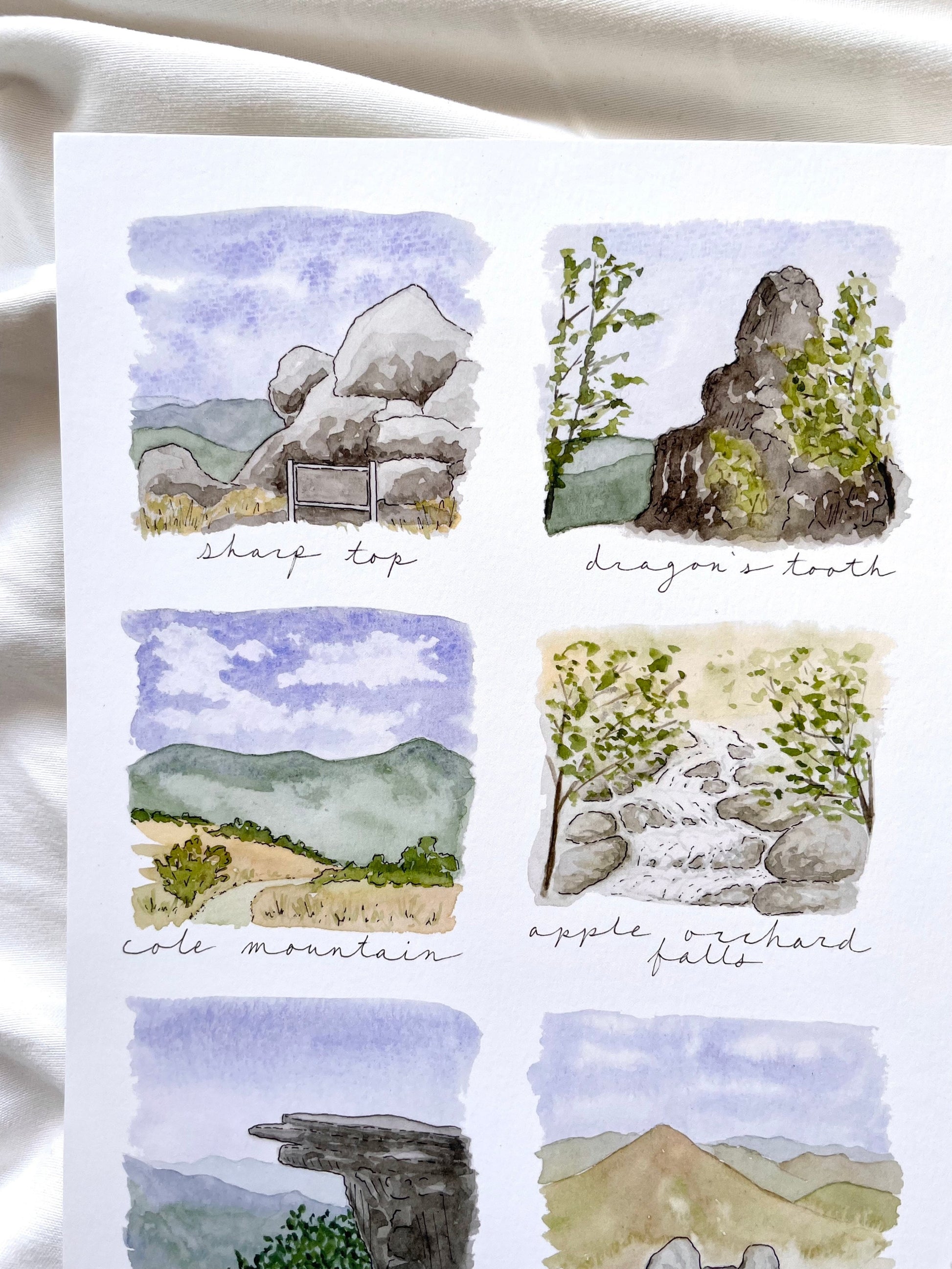 This print features 12 hikes/natural sites around the Blue Ridge: Sharp Top; Dragon's Tooth; Alpine Trail; Cole Mountain; Apple Orchard Falls; Spy Rock; McAfee's Knob; Flat Top; Crabtree Falls; Devil's Marbleyard; Holliday Lake; and Mount Pleasant.