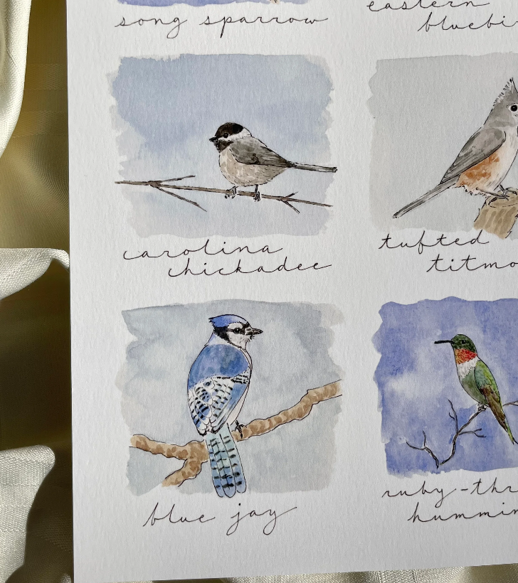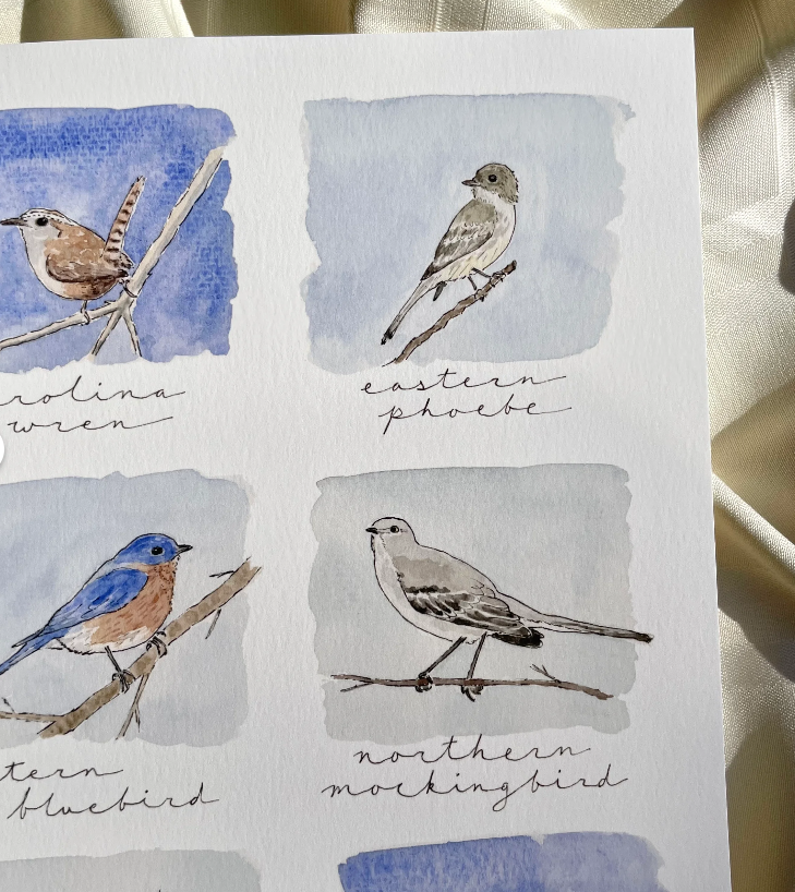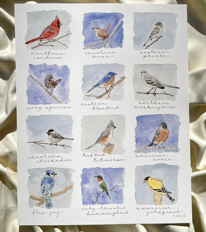This nature journal-style art print displays 12 backyard birds common to central VA!