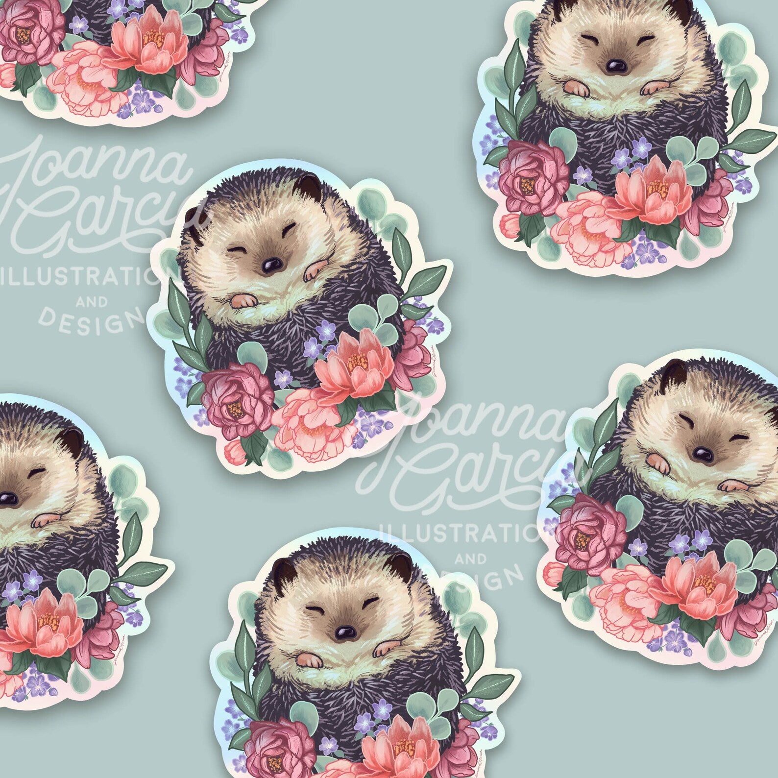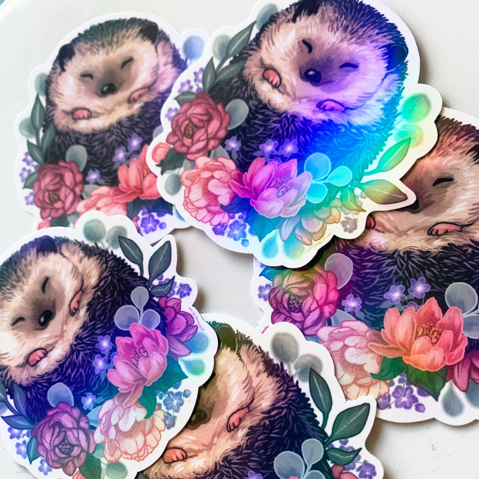 "Hedgehog and Flowers" Vinyl holograph sticker. A shiny little hedgehog friend to put on your laptop, notebook, etc!