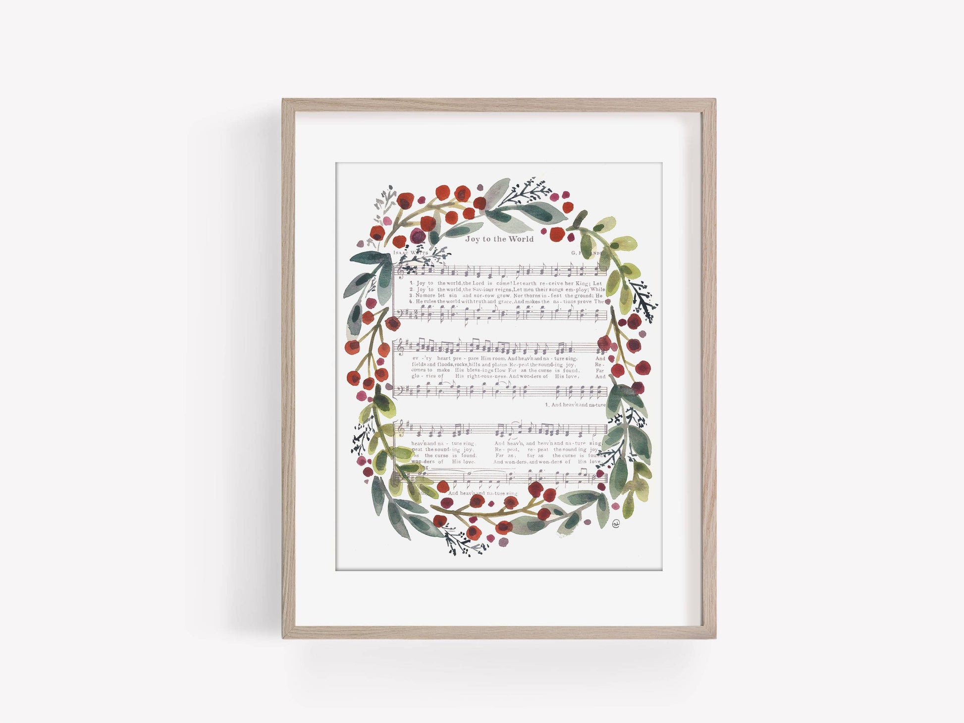 A print of a Marydean Draws original watercolor painting over the hymn "Joy to the World."