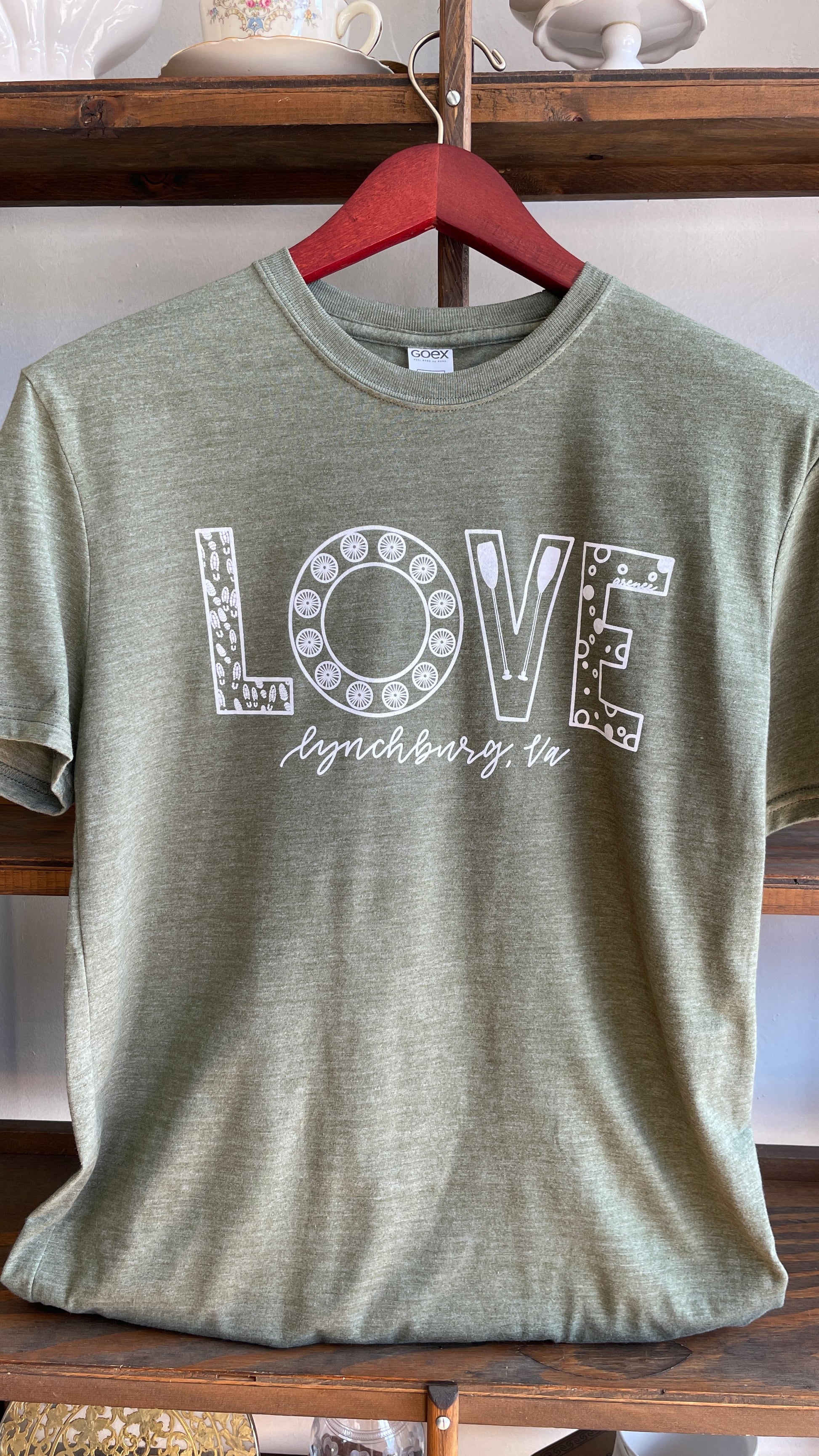 Virginia is for (Local) Lovers! A tribute to signature "love" sign along the Percival's Island trail in downtown Lynchburg, this tshirt is the perfect comfy option for a weekend out in our town!