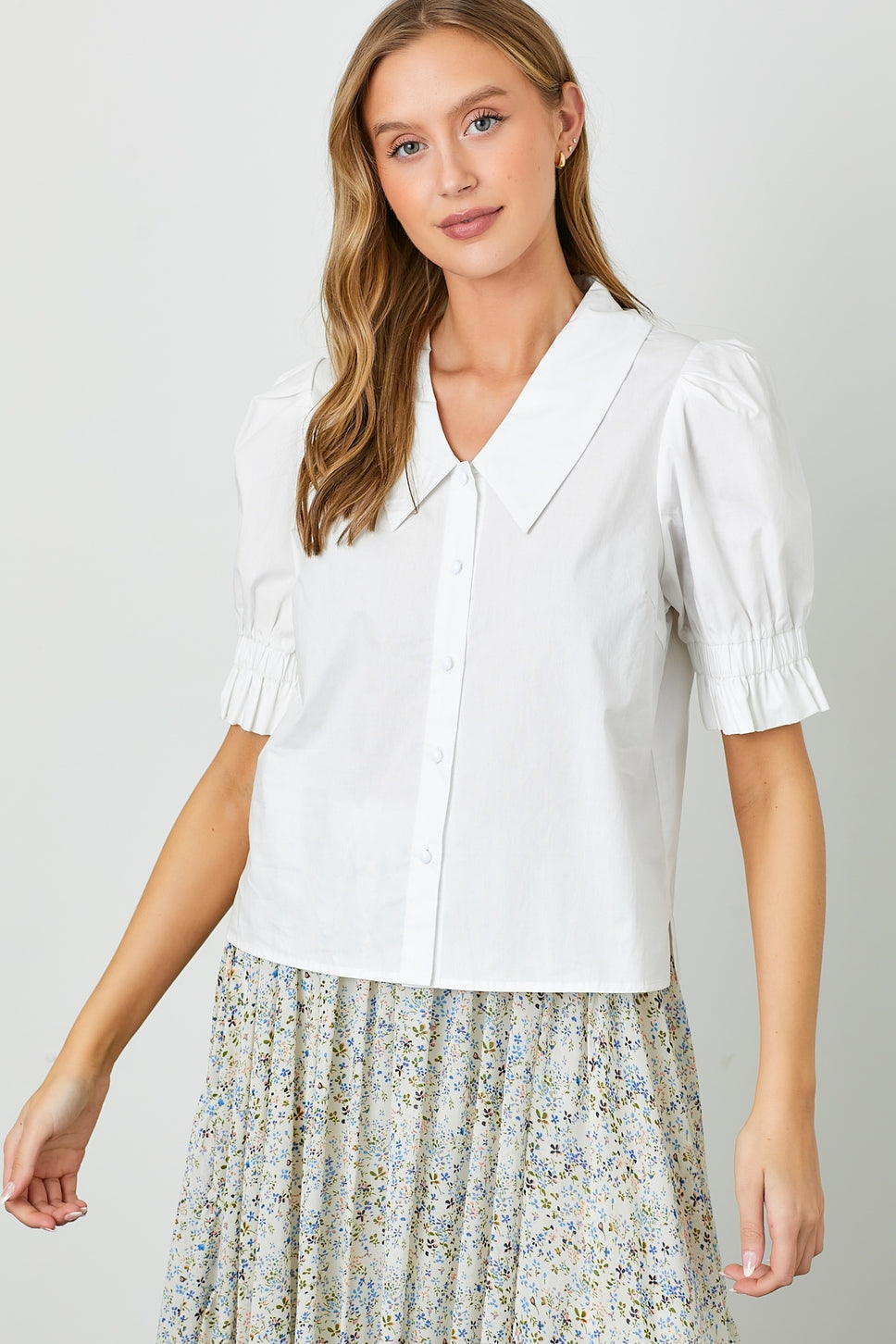 A new classic, this blouse is bound to be in heavy rotation in your closet. This top is chic enough to wear on its own, but its adorable pointed collar and pleated puff sleeves would make it perfect under a vest. Wear it however you want--it's bound to be cute.