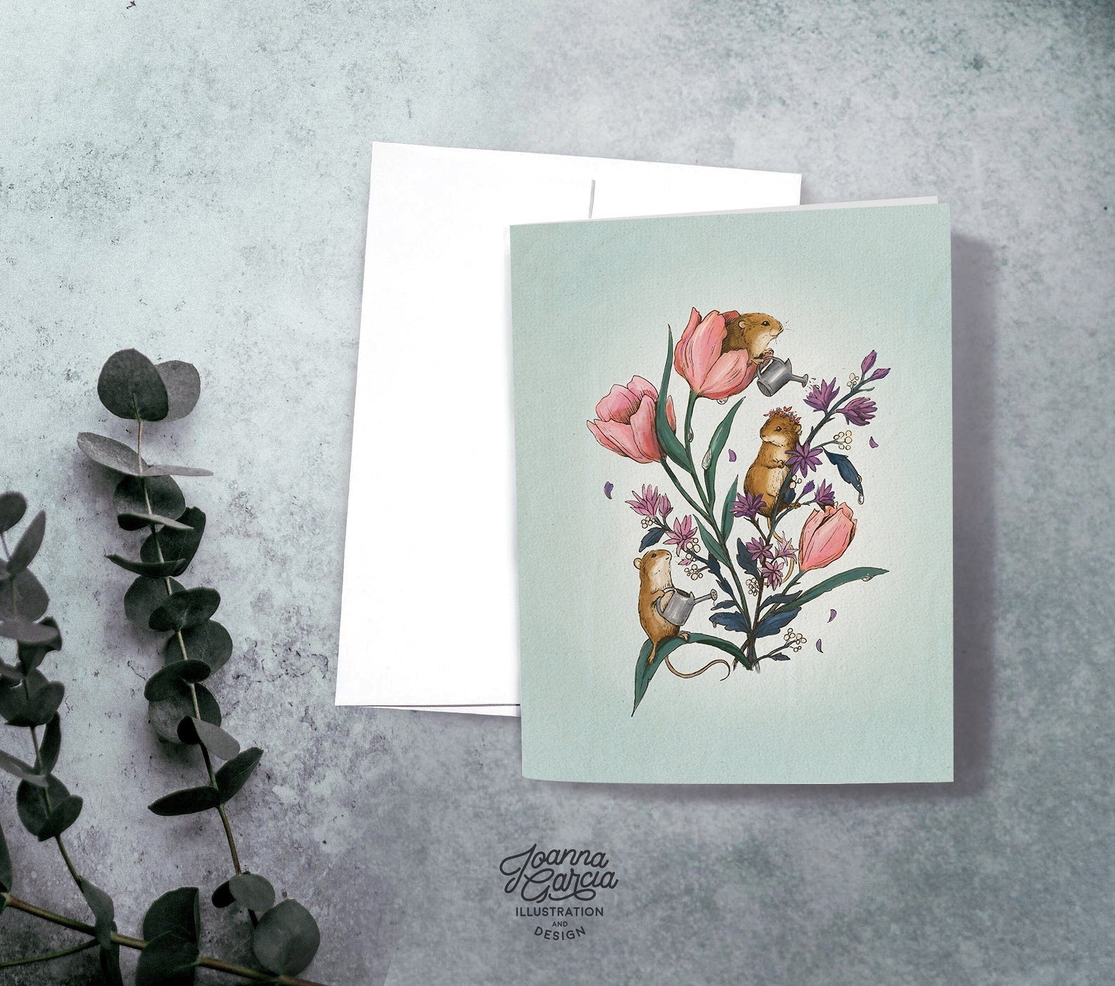 "Little Gardeners" Illustrated Mouse and Floral greeting card. Send a greeting to friends and family with these sweet little mice! Printed on thick, smooth white paper with vivid detail, blank inside.