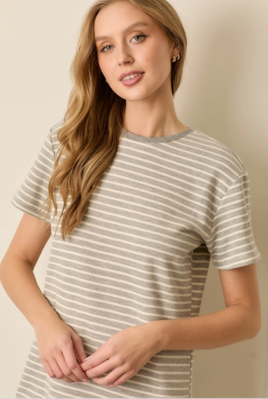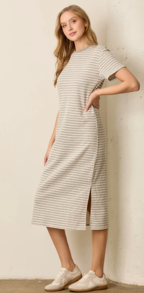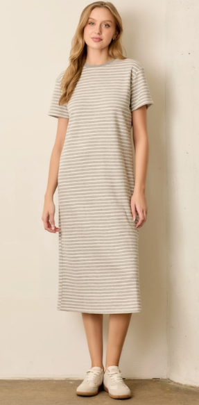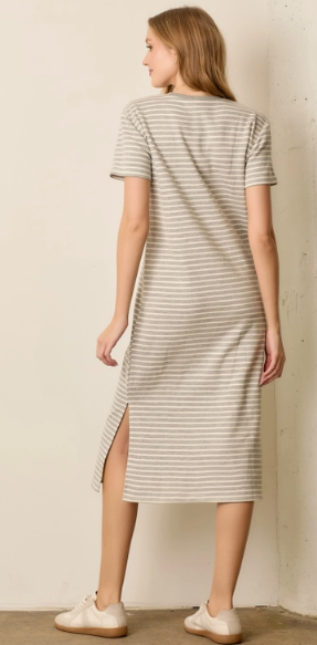 Parisian chic takes a casual turn with this T-shirt maxi dress. This dress prioritizes comfortbility with features such as a soft fabric hand, head-to-toe stripe designs, and a spacious silhouette.