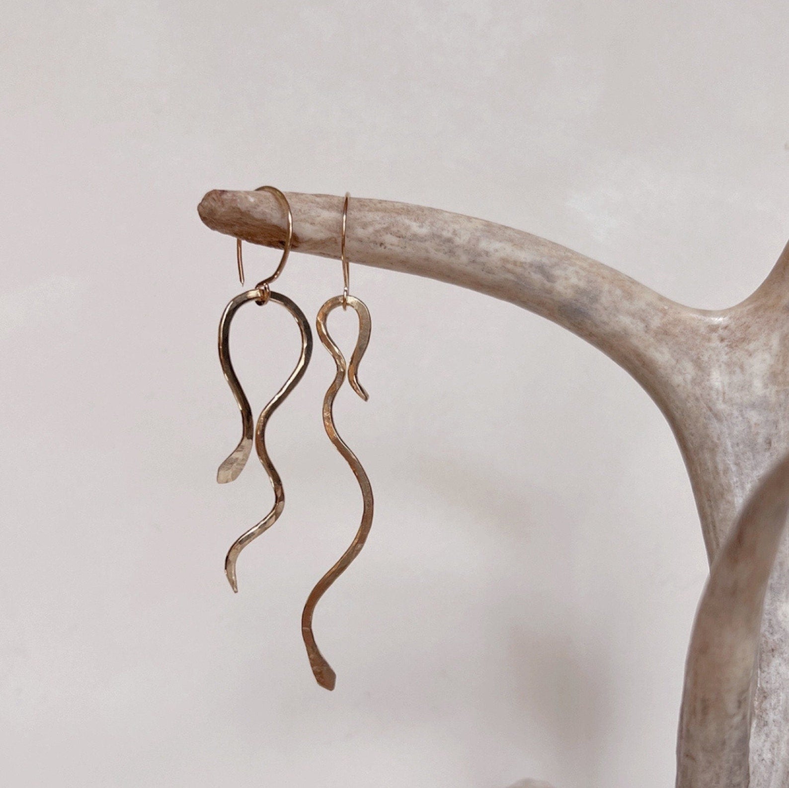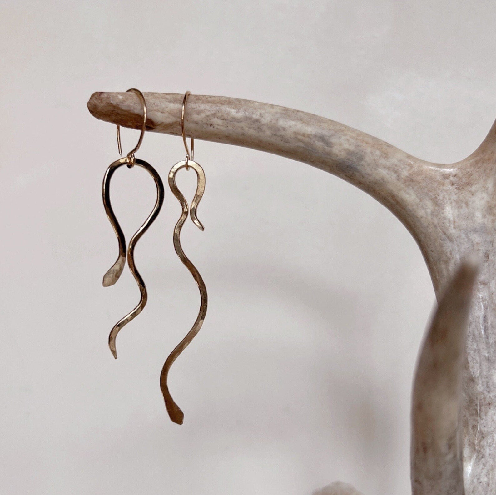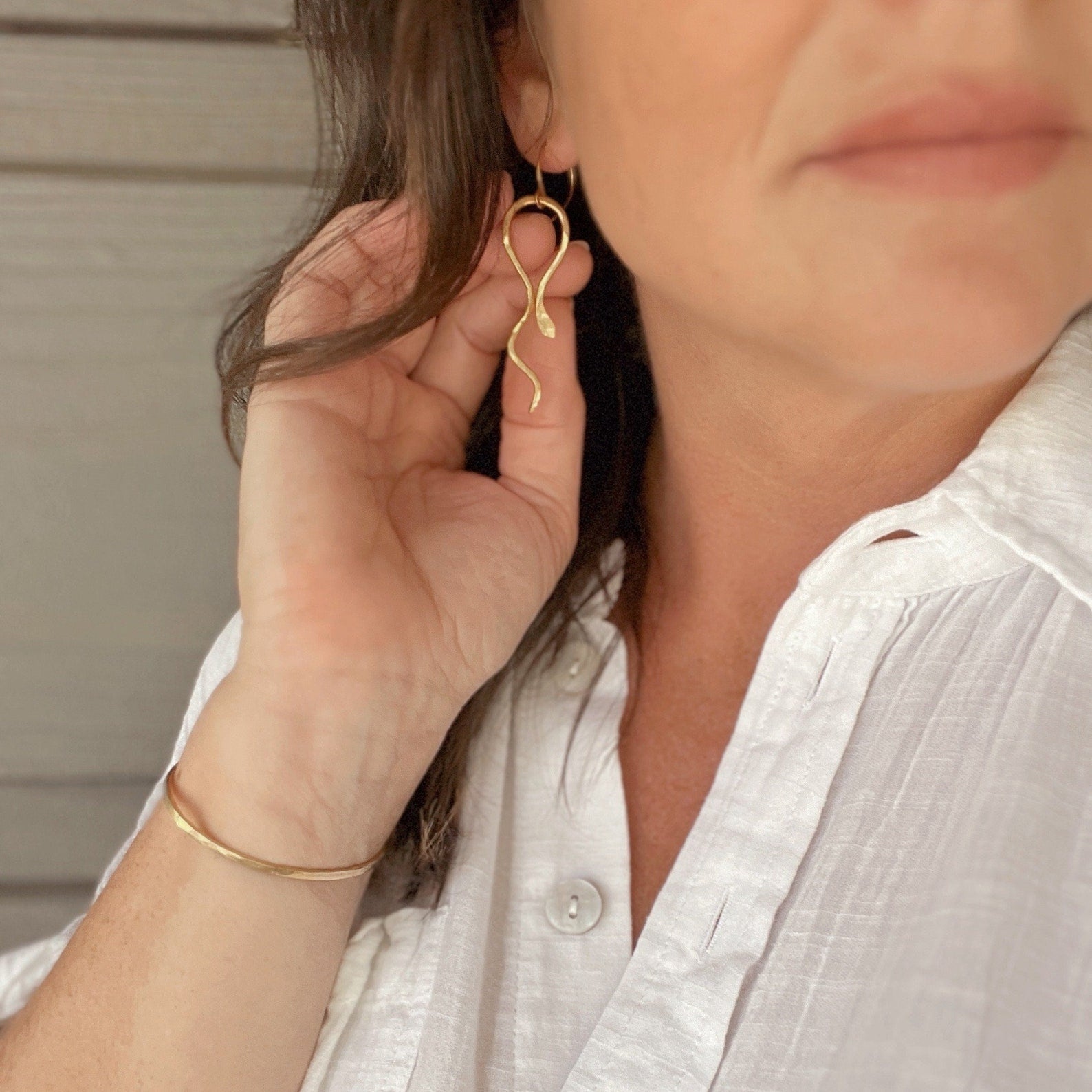 -hand formed and hammered brass snake earrings