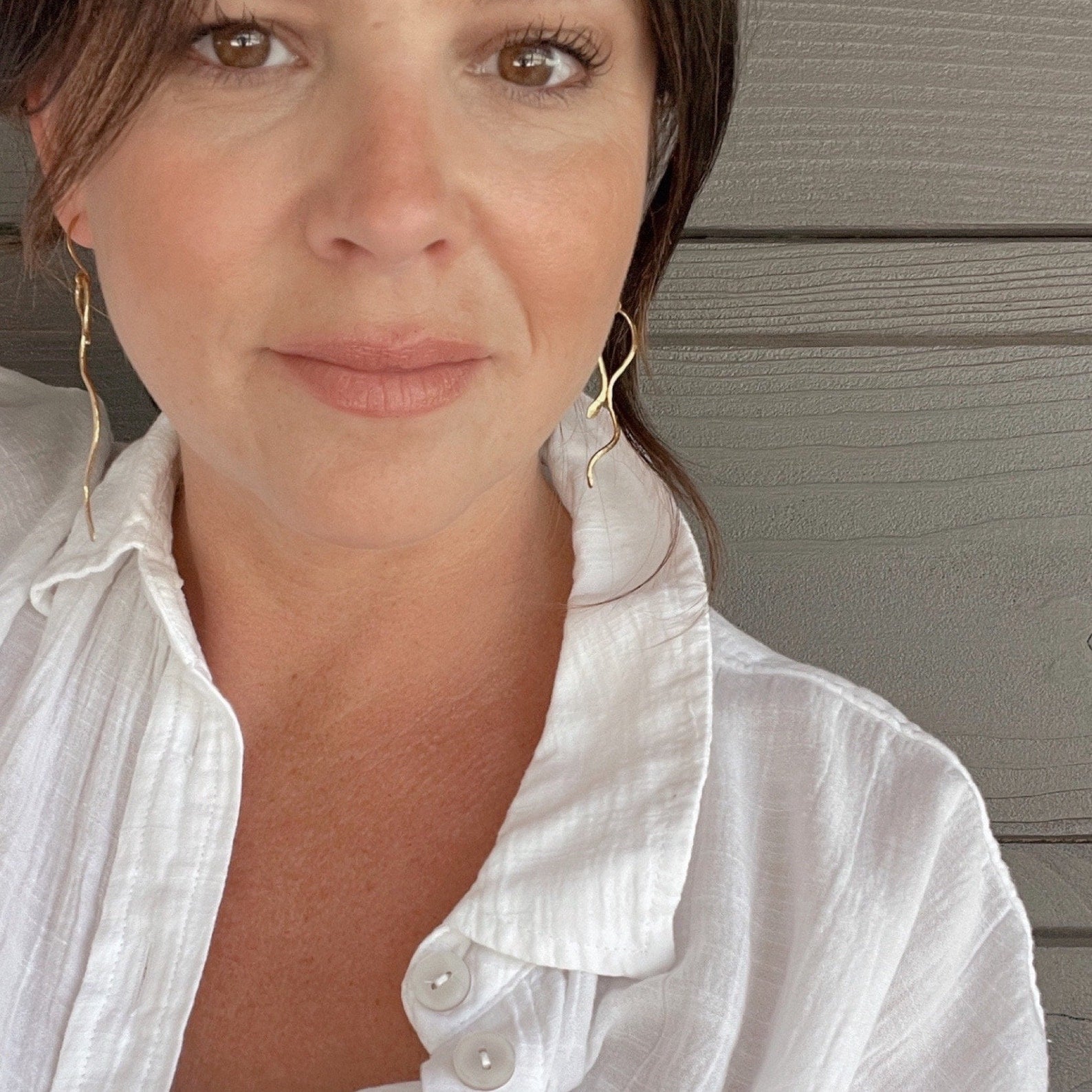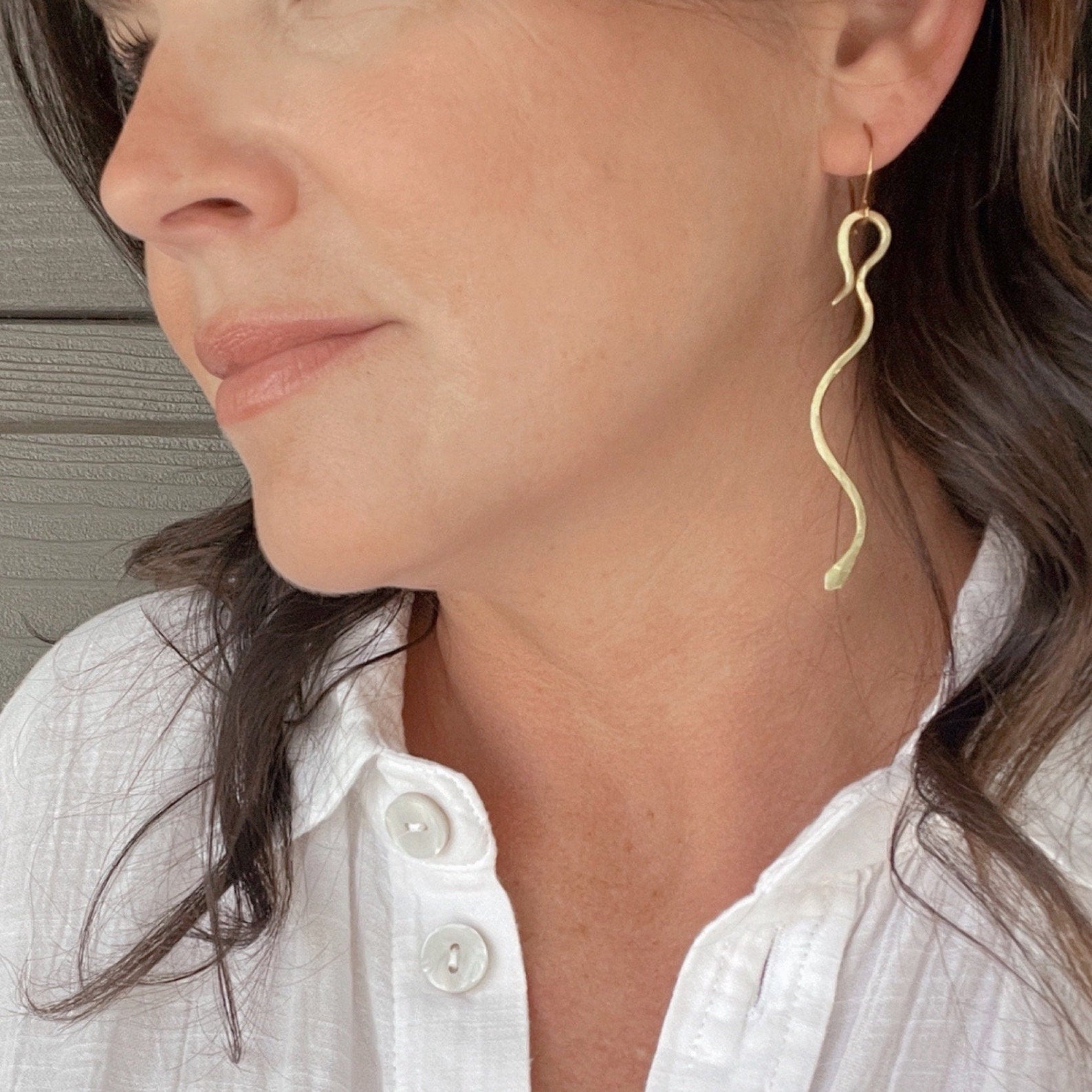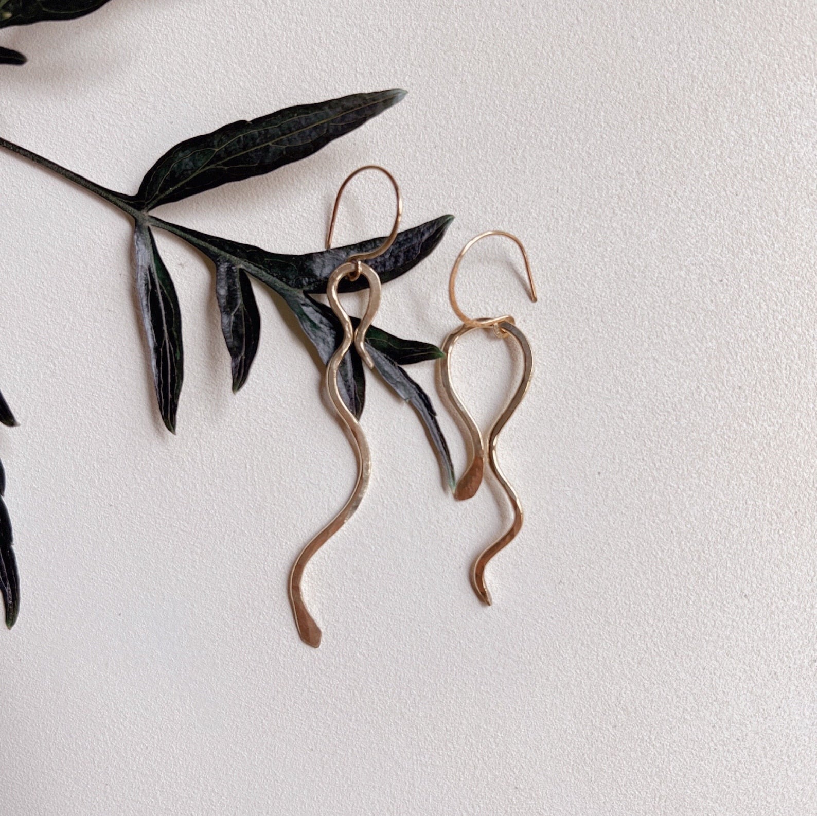 -hand formed and hammered brass snake earrings