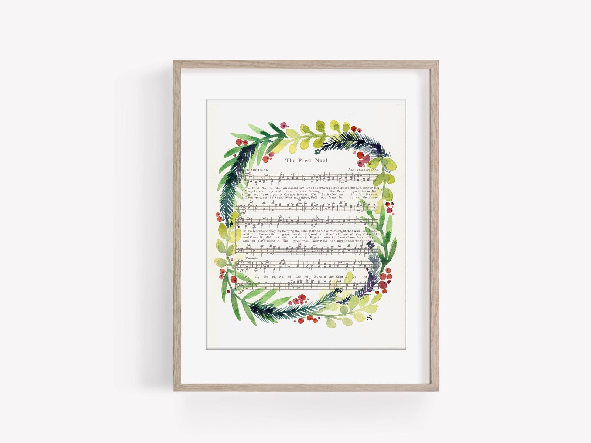 A print of a Marydean Draws original watercolor painting over the hymn "The First Noel."