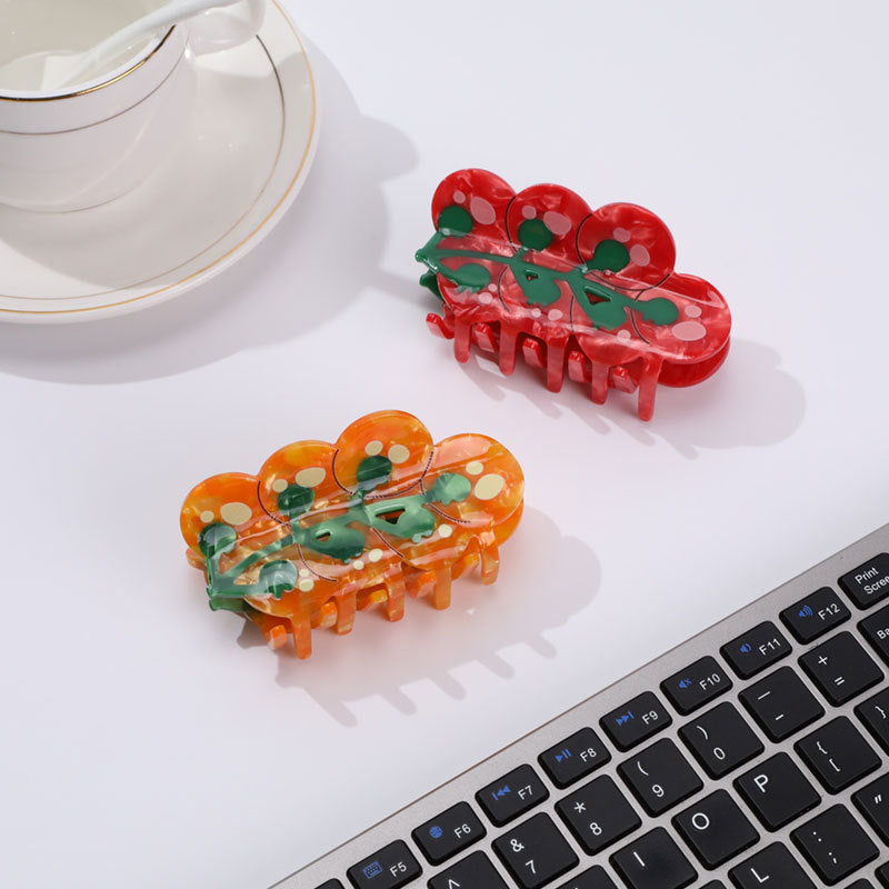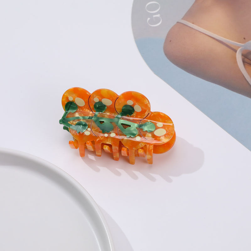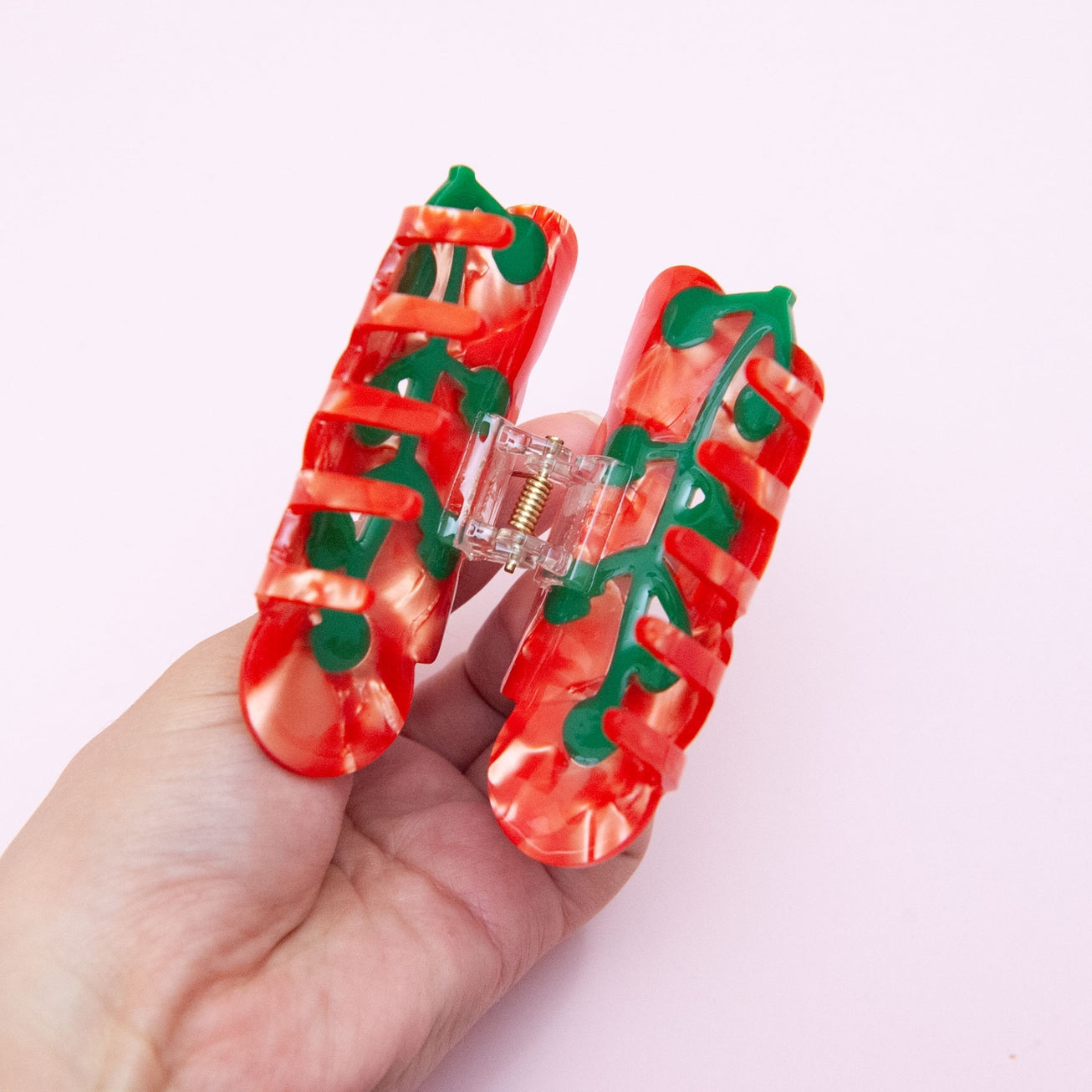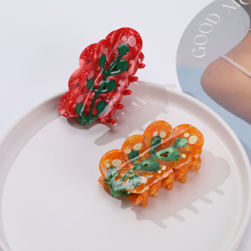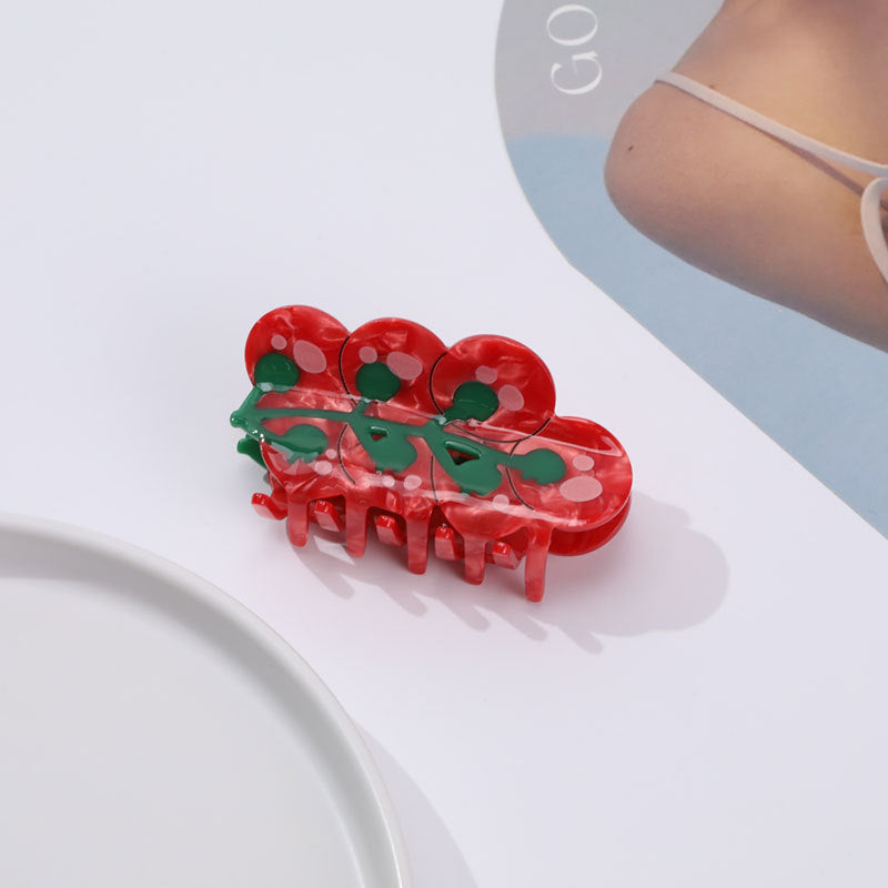 Add a pop of playful charm to your look with this fun clip! Choose between a vibrant red or orange tomato paired with delicate green vine details in a whimsical nod to the farmers' market. Made from durable materials, it’s perfect for securing your hair comfortably while adding a splash of color and personality to your style.