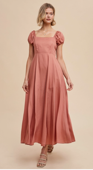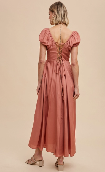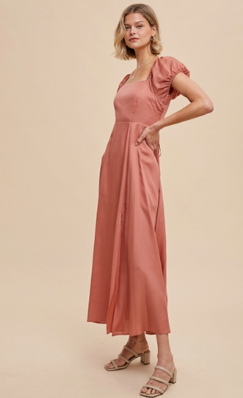 Blend timeless elegance with a modern edge with our Heather Maxi Dress! This romantic dress features a streamlined silhouette with princess seams on bodice, thigh high side slit, puffed sleeves, feminine square neckline, and adjustable corset back. Perfect for occasions ranging from date nights to spring outings to weddings.